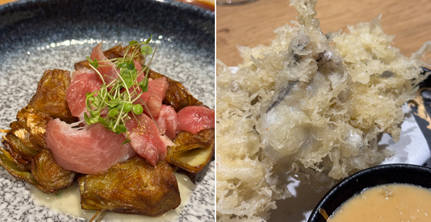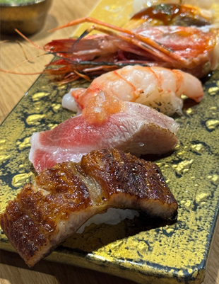 El pulmón del negocio son las prodigiosas manos del equipo manejando el arroz o deslizando el filo de los cuchillos sobre los lomos de pescados de categoría, con los que arman sashimis o cortes crudos, ojo al moriwase especial, que deben encargar con antelación. Detrás, una pequeña cocina bien organizada complementa con platos cocinados todas las filigranas crudas, nigiris de vieira, atún, carabinero, gamba roja, wagyu, parrillero o el de Idiazabal gratinado. Entre esas especialidades curradas al fuego destacan las tempuras, no se piren sin meterse en la boca la kokotxa de merluza, irreprochable y cristalina. También son sobresalientes las empanadillas de cerdo y curry o las rellenas de txangurro a la donostiarra, unas almejas salteadas con sake y jengibre, dulzonas y adictivas y otras delicias como las alcachofas fritas con mendreska de atún. Los especiales aterrizan cuando hay erizos, langostinos de Sanlúcar o carabineros tamaño “Chernobyl”, que planchean o convierten en bocados con arroz y sus correspondientes salsas, sin marear demasiado: primero chupas la cabeza, ¡slurp!, y terminas dándole un tarisco a la cola. La carta de vinos está currada y la chavalada de sala no levanta la vista de la faena que los entretiene, no dedican un solo segundo al compadreo o a darte las clásicas lecciones que recibes en muchos comedores, sin comerlo ni beberlo. Disfruten, que nos quedan dos telediarios.