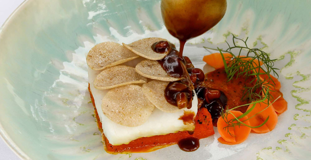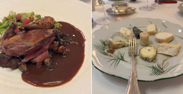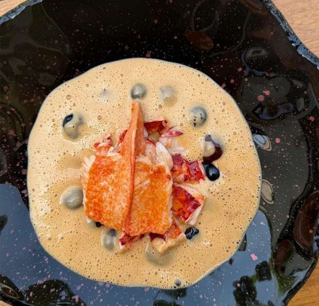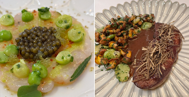 Ducha, me calzo una hortera camisa hawaiana de Carlos el de “papayou”, entro en la sala y nos asalta un escuadrón de camareros, listos para que cenemos como marqueses, ¡iufi! La carta es corta y apetecible y pido cambiar algunos platos del menú degustación por otros que me ilusionan. Pago más, lo que haga falta, soy Raymond Nakachian. Eli “Kimera” es alérgica a los crustáceos y para ella no hay problema, pero para un gordo caprichoso, nada que negociar. Me pongo de mal gas. Caca de la vaca. Mea culpa. Y empezamos con lecciones del maître acerca del refinado trato que se da en Francia a la mujer, como si aquí anduviéramos como Vilma y Pedro Picapiedra. Tampoco allá dieron aún el paso de enseñar la botella que beberás a las mujeres de la mesa, pues es patético que muchos tascos piensen que el “hombre-plátano-balú” es el único individuo con criterio capaz de olfatear y menear una copa, poniendo cara de Vincent Cassel. Picas de aperitivo fríos de nevera, horribles. Personal de sala atropellado, dando vueltas como en el guateque de Peter Sellers. Civet de “apurras” gomosas de bogavante con cerezas (me susurran al oído que acabaré rendido a la salsa, chapoteando pan), ¡no hay quién se lo coma! Foie gras caliente (sale frío) con setas y “pequeñas” habas del tamaño de un balón de reglamento, “petites féves”, ¡menuda risa, tía Felisa! Y como remate, pichón gomoso con setas y guisantes ácidos y resbalosos, “petit pois à la française”.