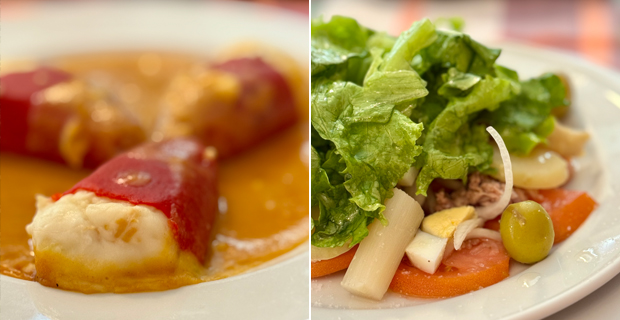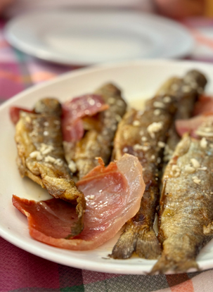 Con las truchas fritas de Etxebertzeko Borda, debe emplearse el mismo proceder. Salen al comedor que son un primor, retostadas y recostadas en bandejas con abundante ajo picado y tajadas gordas de jamón salado con tocino, que perfuma el asunto con un saborcillo bien particular. Agarras la cola y la levantas con un ágil movimiento de los dedos pulgar e índice, llevándote parte del pellejo. La colocas sobre un currusco de pan untado con la grasa y un tiento de jamón y paladeas con deleite, ¡qué maravilla! Te trincas la cabeza, arrancándola con precisión de relojero, sintiendo los huesecillos torrados dando vueltas por tu paladar. El último pase es atacar la carne desnuda de los lomos, levantando una raspa, que está vez sí, desprendes con facilidad y de una pieza, dejando al aire una espina fina como el sedal. Alternas bocado de pescado, chusco de pan pringado en aceite con ajos y grasa de jamón y tocino, ¡mátame, camión!