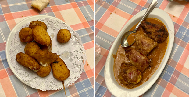 Luego atizamos a los fritos, que Imanol borda como ninguno, meneando la bechamel al fuego, enfriando la masa y boleando a mano como siempre fue. Pilla dos cucharas y golpea la bola como Alcaraz hasta el fondo de pista, sobre la harina, rápido al huevo, pan rallado y a la sartén hasta que doran, formando una costra crujiente que esconde rellenos cremosos y fundentes. Si un día cenan en el Kasino, lo verán arrancarse con la confección de los fritos a medianoche, pues lo mismo se lía con la roux, la mantequilla y la harina o se enreda deshuesando ciruelas claudias para confeccionar esos tarros de jaleas y mermeladas que acaban en manos de algunos privilegiados. Son un despiporre esas blondas pringosas de grasa reventonas de croquetas, San Jacobos, huevo Villerruá y todo tipo de virguerías empanadas. Las variedades cambian según el humor y los antojos que esa semana tengan en cocina.