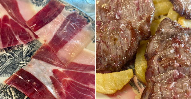 Manolo se come un plato todos los días, granice, llueve o truene, y Loli, su mujer, le recuerda los tiempos de a seis pelas el kilo de jamón, desvelando el secreto de la eterna juventud de los mayores del pueblo, longevos gracias a la preciosa medicina infiltrada en la grasa del cochino curado. En su cuadrilla, algunos superan los cien porque comen jamón todos los días. Abrieron en 1947 y sus mesas vieron pasar carros, arreos, acorazados, blindados y carretas, imagínense el percal. En la carta reza una maravilla digna del mismísimo Julio Verne, “según el diario Británico The Guardian y su reconocido gastrónomo Killian Fox, este restorán fue elegido mejor lugar del mundo para comer Jamón Ibérico». Mátame camión, no pueden ser más leyenda. Ese reconocimiento lo consiguen ofreciendo material criado y curado en las dehesas del Parque Natural Sierra de Aracena y Picos de Aroche. Rebanan a cuchillo lomito de presa, caña de lomo, salchichón o morcón y Emilio, el jefe de cocina que lleva más de cuarenta años con la familia, guisa todas las especialidades que atraen a los clientes: revueltos, tortillas, verduras salteadas, setas, huevos fritos, pollo en salsa, conejo a la cazadora, rabo guisado, perdiz, manos de cerdo, san Jacobo especial o carnes ibéricas tostadas, solomillo, presa, lomo relleno, secreto o pluma. Los postres son pantagruélicos, flan, natillas y arroz con leche con costra tostada, tocino de cielo, manzanas asadas y helados. Disfruten, que nos quedan dos telediarios.