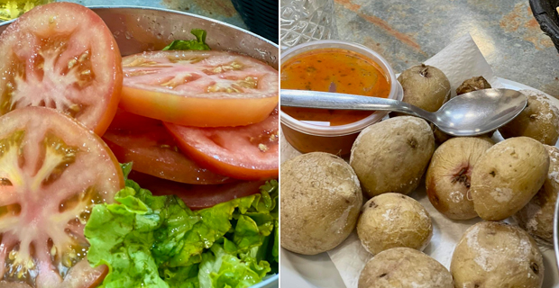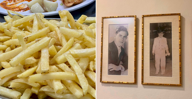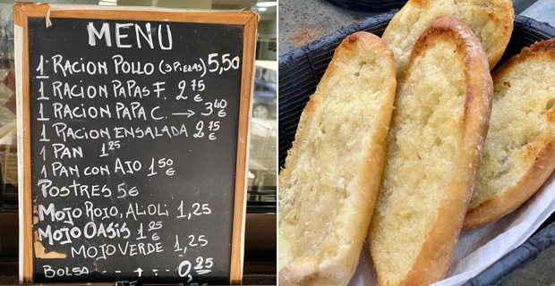 También les digo que el mejor pollo frito lo comerán al final del día, cuando el aceite de fritura oscurece y pilla toda la sustancia de los cientos de pollos que desfilaron antes, ténganlo en cuenta porque está más sabroso, crujiente y “flamenco” que el tempranero. La oferta está escrita en una pequeña pizarra: ensalada, papas arrugás con mojo rojo o verde, patatas fritas blandurrias que no valen un pimiento, el pollo frito que llaman “picante” y pan normal o de ajo, que son bollos abiertos y empapados de mantequilla y ajo. Si van con niños, fríen pollo normal para que los chavales no pongan pegas. Rasguen el pollo con las manos y disfruten de los pellejos chamuscados untándolos en la salsorra de la bandeja. Son cucos, porque fríen solo muslos, mucho más jugosos. Para beber, cerveza de cañero y una digna selección de vinos expuesta en vitrinas refrigeradas junto a un arcón llenos de polos, magnums y cornetos. Hay postres caseros, copas de cremas de sabores dulzonas que podrían fulminar a un diabético: “polvito uruguayo”, “maracuyá”, “ron caramelo”, “higos”, “tres leches”, “chocolate Nutella” o “plátano galletas”. Disfruten, que nos quedan dos telediarios.