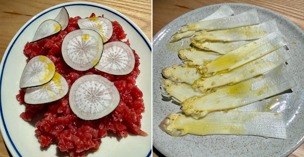 Al Etxemaite se le ven las costuras en su austera decoración, la vajilla, las mesas de refectorio de cuadro de Zurbarán, en su carta de vinos “naturetis” y en sus platillos “verdes”, fraguados en un huerto que cultivan en Aia, con el que abrazan a toda la materia prima que encuentran en el mercado. Manejan el cotarro entre Paolo e Iker, en cocina, y Eukene y Verónica en sala, batiéndose el cobre para que todo marche bien, atentas y cariñosas para que nada falte. Están todos cortados por el mismo sastre. Siempre hay ensalada de temporada, y no es coincidencia que en la balda tengan libros de Momofuku y Alain Passard, clásicos modernetas de “fermentador autosuficiente”. Bromas aparte, recolectar tu verdura es un lío de tres pares, desvelarse para meter en un cesto tomates, rábanos negros o achicorias rojas, los imagino yendo y viniendo sin aliento, sin fular rosa ni ondeando su melena blanca al viento como hace el chef Passard cada vez que recolecta sus primores verdes, celebrando la llegada de endivias, habas o ruibarbos, pegando saltos de alegría y besuqueando apionabos, mazos de hierba luisa y calabacines.